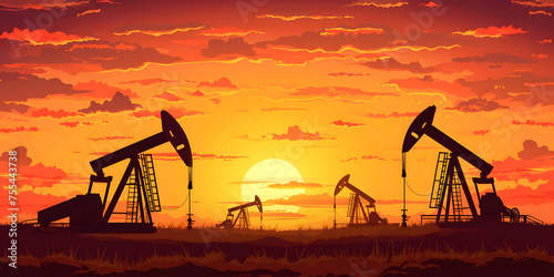 A painting of a desert landscape with three oil wells in the foreground. The sky is blue and the mountains in the background are covered in clouds