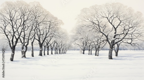 a painting of a snowy landscape with trees in the foreground and snow on the ground in the foreground.