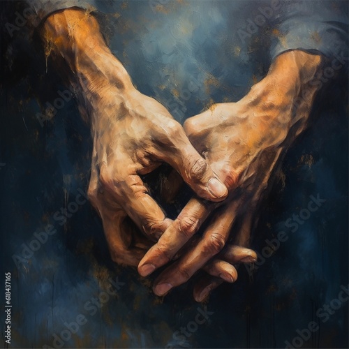 a painting of hands holding each other with dark blue background