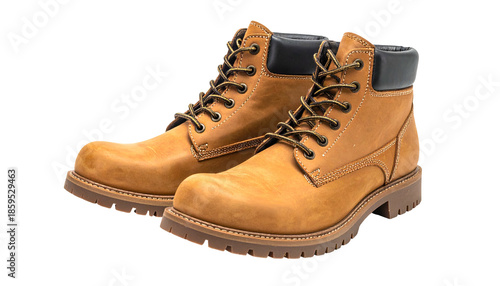 boot, work, leather, tan, brown, pair, footwear, shoe, construction, safety, rugged, hard-wearing, strong, rough, texture, detail, closeup, isolated, background, black, colours, fashion, style, classic, practical, utility, equipment, gear, guardian, ankle, lace, stitching, sole, rubber, toe, heel, top, collar, warm, comfort, support, heavy, wear, modern, design, element, image, product