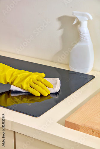 A pair of yellow rubber gloves cleaning the kitchen sink area with a spray bottle nearby. A cozy home cleaning scene captured in soft natural lighting.