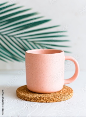 mug, ceramic, pink, coaster, cork, leaf, tropical, white, table, light, simple, natural, home, pastel, subtile, empty, hot drink, tea, minimalist, still life, decorative, textured, warm, smooth, modern, spring, summer, beautiful, colourful, bright, creative, elegant, stylish, professional, vibrant, stunning, amazing, marvellously, fantastic, gorgeous, lovely, charming, attractive, impressive, spectacular, magnificent, excellent