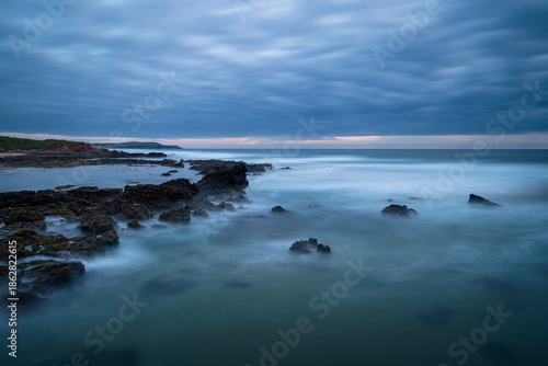 A panoramic seascape of beautiful blue ocean with soft, silky water washing over rocks. With cliffs and an island landscape in the distance and a stormy sky above. Photographed at Phillip Island.
