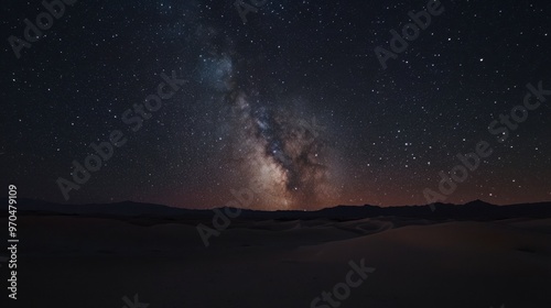 A panoramic shot of the desert under a starry night sky, with the Milky Way visible above the dark, quiet landscape.