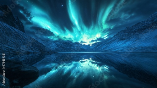 A panoramic view of the Northern Lights over a picturesque fjord, with dramatic auroras swirling in the sky and reflecting in the tranquil waters below.