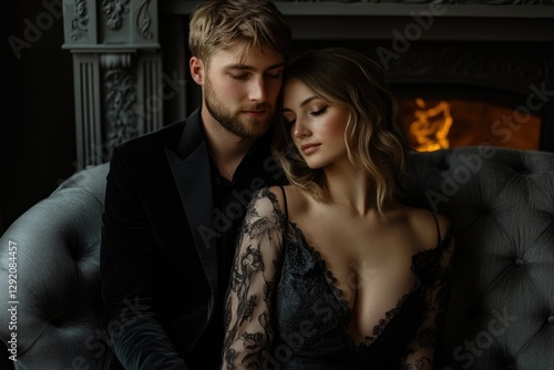 couple, intimacy, love, romance, passion, fireplace, fire, dark, black, elegant, dress, suit, tuxedo, sensual, attractive, beautiful, photogenic, model, photoshoot, photo, portrait, indoor, romantic, cosy, mysterious, intimate, seductive, fashion, style, glamour, luxury, velvet, lace, hugs, closeness, togetherness, human relationships