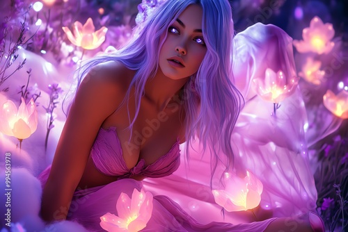 pastel, sorcerer, lavandula, hair, flowing, pink, gown, sitting, glowing, cloud, up high, magical, garden, her, eye, sparkle, she, watches, flower, bloom, soft, moonlight