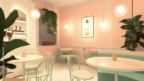 A pastel-themed cafe interior with light peach walls,