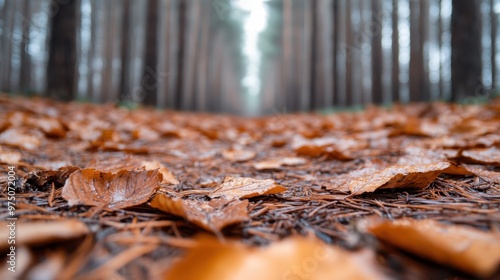 A pathway in the forest covered with fallen brown leaves, with towering trees lining up symmetrically, delivering a serene and calm setting in the natural autumn season.