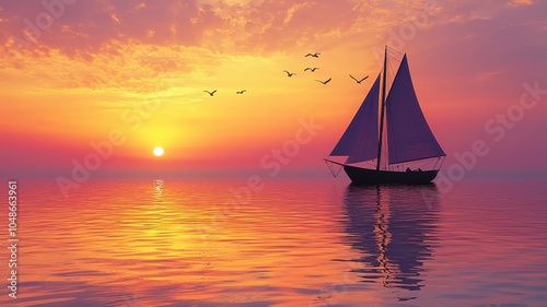 A peaceful sunset over calm waters with a sailboat and birds, creating a serene and beautiful coastal scene.