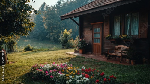 A peaceful wooden cabin with beautiful flowers and lush greenery