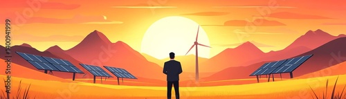 A person admires a sunset over solar panels and wind turbines, showcasing renewable energy.