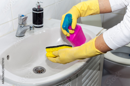 bathe, bathroom, chemical, clean, cleaner, detergent, domestic, equipment, faucet, glove, home, house, housekeeping, homemaker, housework, hygiene, interior, maid, modern, room, service, shiny, sink, sponge, spray, white, wipe, work, men at work