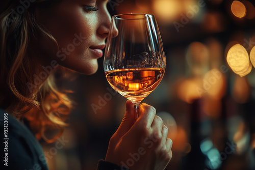 A person delicately holding a glass of wine, taking a slow sip and appreciating the deep flavors,