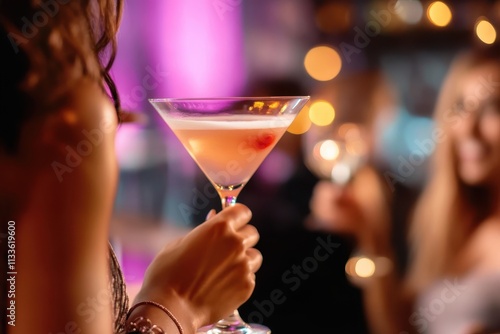 A person elegantly holds a cocktail glass with vibrant pink lighting and blurred background, highlighting a social party atmosphere and celebration.