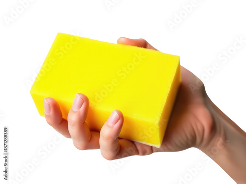 A person holding a yellow block of soap, possibly used for cleaning or personal hygiene
