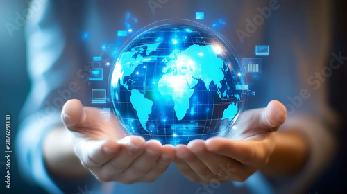 A person holds a glowing digital globe in their hands, representing global connectivity.