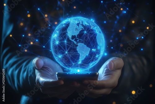 A person holds a smartphone with a glowing holographic globe floating above it and digital network of the globe shows interconnected points and lines