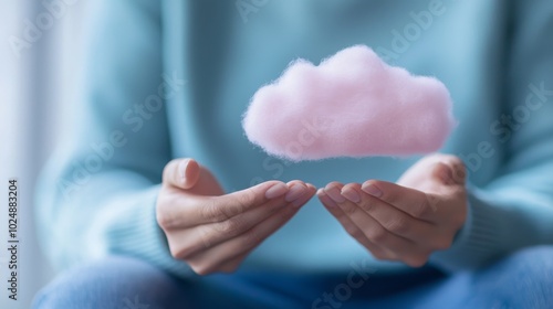A person holds a soft pink cloud in their hands, symbolizing dreams and creativity, set in a serene, cozy environment.