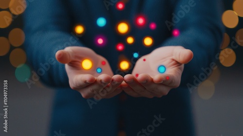 A person holds out their hands, displaying colorful, glowing orbs against a blurred background, symbolizing creativity and the sharing of ideas.