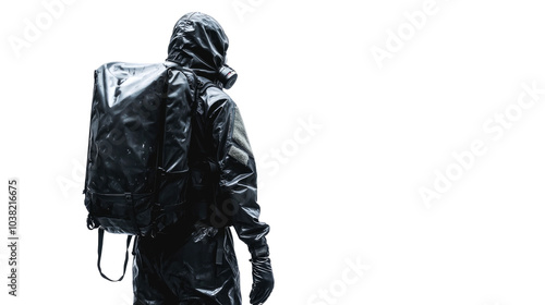 suit, gas-mask, backpack, safety, protection, contamination, chemical, biological, hazardous, industrial, men at work, industry, danger, toxic, environment, equipment, isolated, white background, back, turn, looking, wearing, gear, health, risk, clean, hazard, emergency, medicals, pandemic, virus, pollution, quarantine, epidemic, security, glove, clothing, protective, man, person, standing, background, black