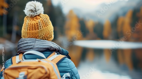 A person in a cozy warm outfit, including a beanie, looking thoughtfully across a calm lake during autumn, reflecting a moment of peace, introspection, and natural beauty.