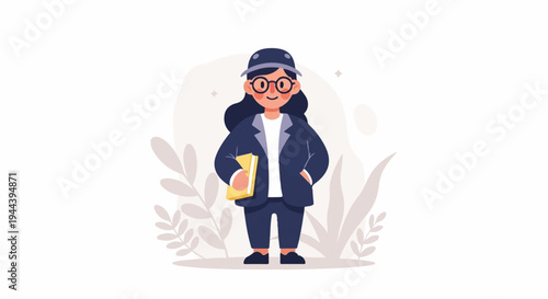 person, woman, female, character, illustration, stylised, cartoon, drawing, graphic, design, art, flat, vector, icon, simple, minimal, modern, clean, white, background, studio, portrait, full, body, standing, holding, book, yellow, object, wearing, dark, blue, suit, jacket, pant, shirt, cap, goggles, round, eyeglass, cute, friendly, confident, professional, creative, cognition, learning, education, success