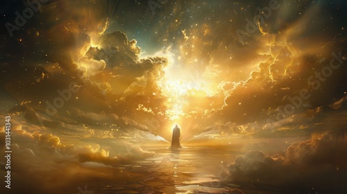 person, walking, beach, sky, cloud, sun, shining, brightly, nature, light, man, space, landscape, night, beautiful, water, fantasy, ocean, travel, illustration, horizon, star, concept, background, human, sea, sunset, peaceful, universe, surreal, dream, blue, god, heaven, planet, abstract, alone, galaxy, cosmic, mystery, boat, view, art, artwork, glow, loneliness, imagination, dark