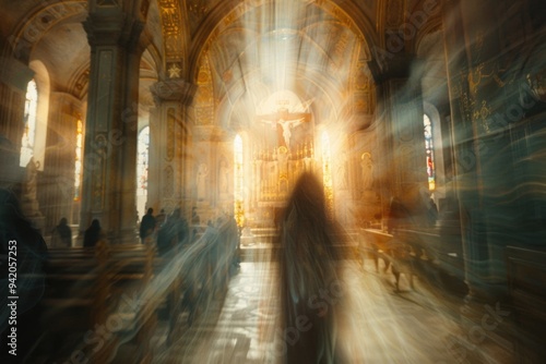 A person is walking through a church, blurred in the background