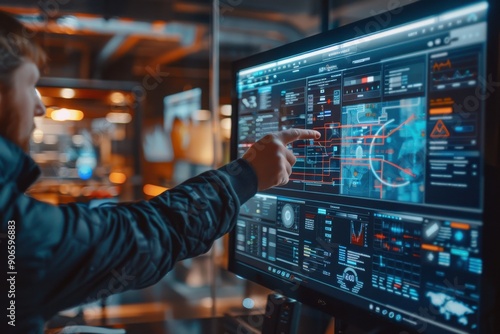 A person pointing at a futuristic computer screen, demonstrating technological interfaces, sophisticated data visuals, and modern control panels in a professional environment.