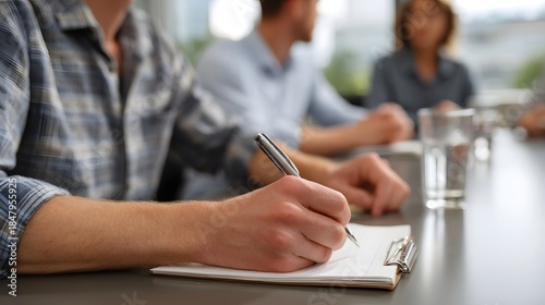 A person s hand actively writing notes on a clipboard during a business meeting with colleagues blurred in the background