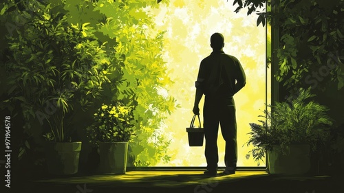 A person stands at the threshold of a lush garden, holding a bucket and surrounded by vibrant greenery, symbolizing growth and renewal.