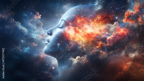 A person with a transparent head, and abstract clouds, stars, and cosmic shapes emerging, representing the universe of the mind