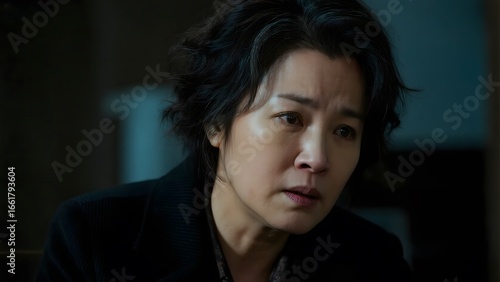 A person with short hair, wearing a dark jacket, appears contemplative in a dimly lit indoor setting.