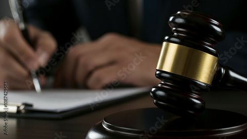 A person writes on a paper beside a judge's gavel on a desk.