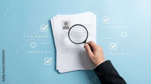A person's hand holds a magnifying glass over a resume stack, with illustrative checkmarks and circles floating on a blue background.