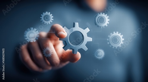 gear, technology, innovation, business, system, process, engineering, development, solution, automation, concept, connection, network, digital, future, design, industry, machine, cog, mechanism, progress, teamwork, strategy, success, efficiency, optimization, control, management, structure, component, assembly, hardware, software, interface, touch, hand, man, person, working, creating, visual, abstract, background, blue, metallic, three-dimensional, rendering, closeup, idea