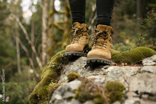 A person's hiking boots on a moss-covered rock, suggesting an outdoor activity or adventure