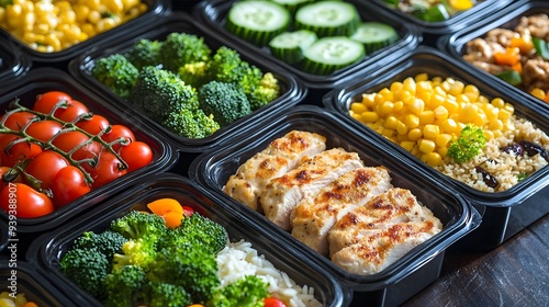 A photo of various meal boxes filled with chicken, vegetables, and fruits arranged neatly in black plastic containers