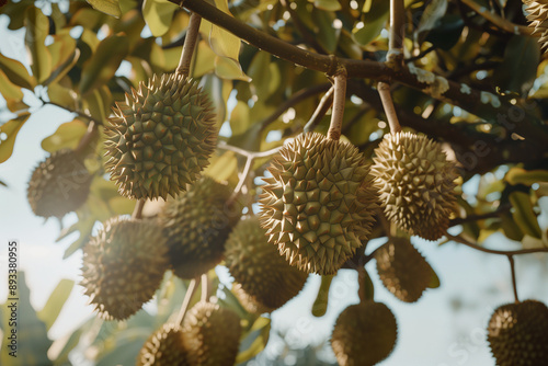 A photo shows durian hanging from a tree, with several large and small fruit on different branches