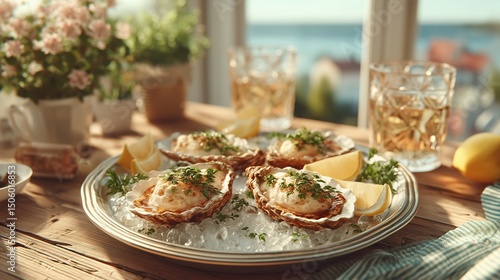 A photorealistic, highly detailed tray of fresh oysters on crushed ice, garnished with lemon wedges and parsley, on a silver platter, rustic wooden table, soft