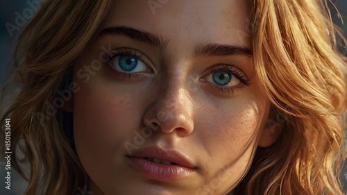 A photorealistic portrait of a 27-year-old italian girl like *fill connu et belle* with short, flowing caramel blonde hair and striking blue eyes. She should have a natural, approachable expression an