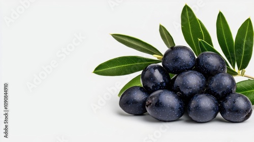 A photostock of black olives and olive leaves arranged neatly on isolated on transparent PNG background, High Quality.