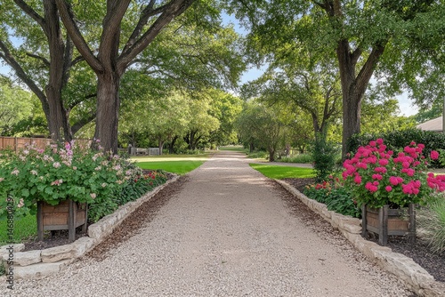 driveway, tree, flower, landscaping, garden, nature, path, paseo, peaceful, tranquil, beautiful, scenic, charming, elegant, home, property, summer, spring, lush, green, vibrant, pink, red, foliage, gravel, stone, border, plant, shrub, bush, decorative, exterior, view, residential, landscape