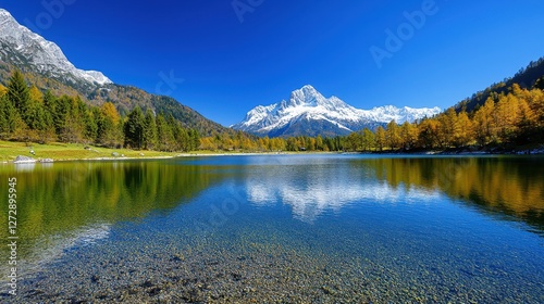lake, mountain, sky, blue, water, landscape, snow, peak, grass, green, tree, clear, alpine, meadow, nature, scenery, calmness, summer, wilderness, outdoors, pristine, environment, idylli, panorama, turquoise, shore, vegetation, plant, algae, growth, peaceful, serene, ecology, ecosystem, sunlight, daylight, travel, tour tourism, destination, vista