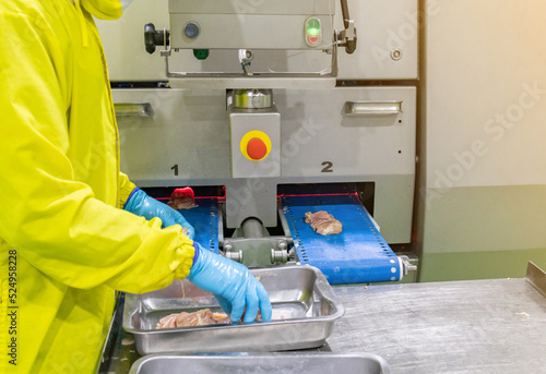 A piece chicken meat on conveyor belt to automatic cutting machine .