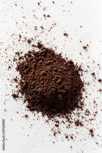 A pile of dirt sits on a white surface, perfect for use in editorial or design contexts where a natural texture is needed