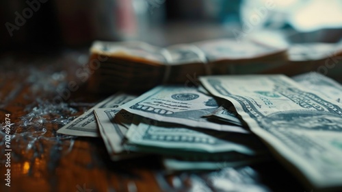 A pile of money sitting on top of a wooden table. Suitable for financial, business, and investment concepts