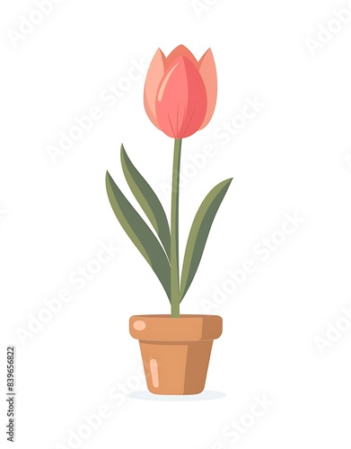 A pink flower growing in an open pot, flat design with simple lines and solid colors on a white background