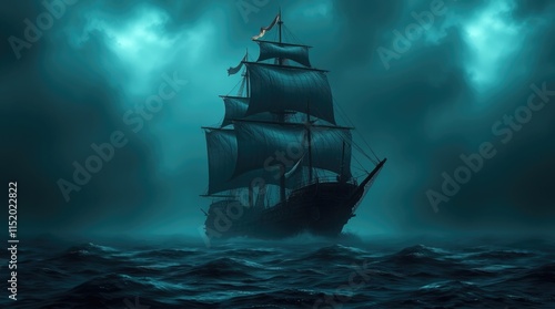a pirate ship in horror black blue sky, sea haunted cloud, scary ocean, depression background, mystery gloomy dark theme, blur texture,